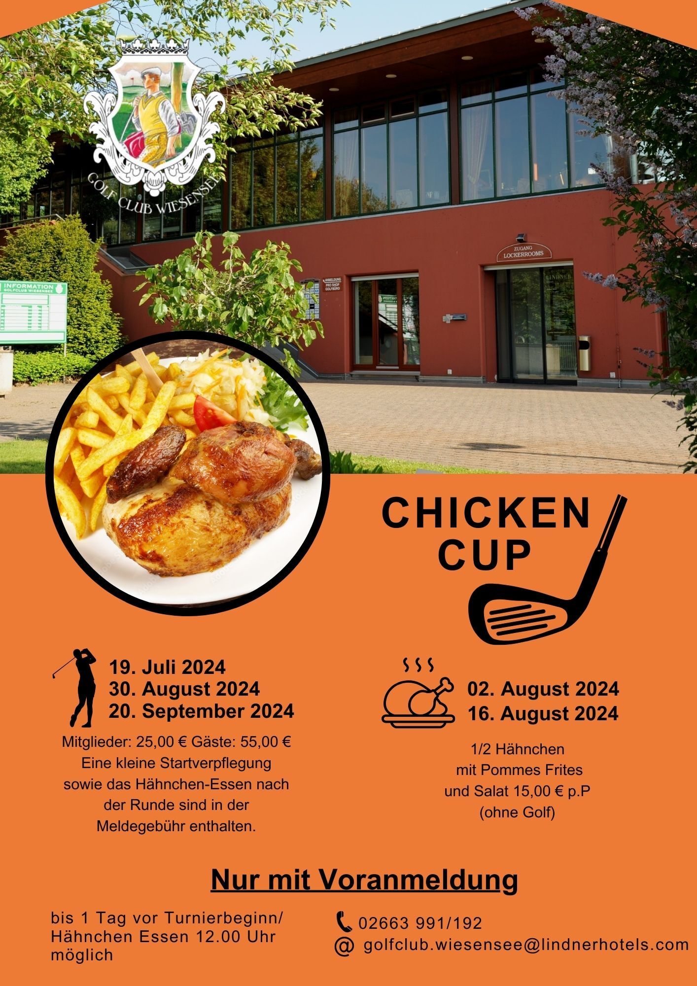 Hähnchen-Essen 02. August 2024, 16. August 2024 1/2 Hähnchen mit Pommes Frites und Salat 15,00 € p.P (ohne Golf) |